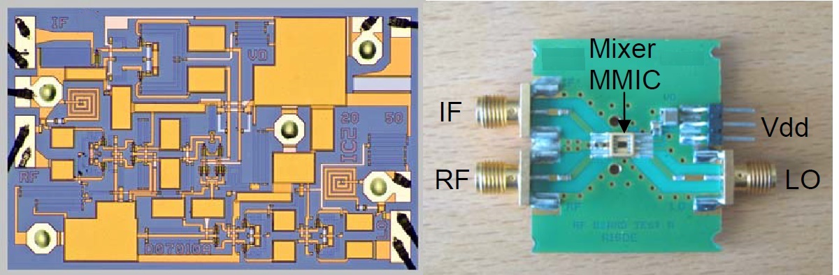 A high performance GaAs pHEMT technology based active double balanced mixer MMIC. This mixer covers a very wide frequency range with a conversion gain of typically 12 dB, and uses an active Gilbert Cell Mixer Structure. The die is manufactured using 0.18 μm gate length pHEMT Technology. The MMIC uses gold bond pads and backside metallization and is fully protected with Silicon Nitride passivation to obtain the highest level of reliability.