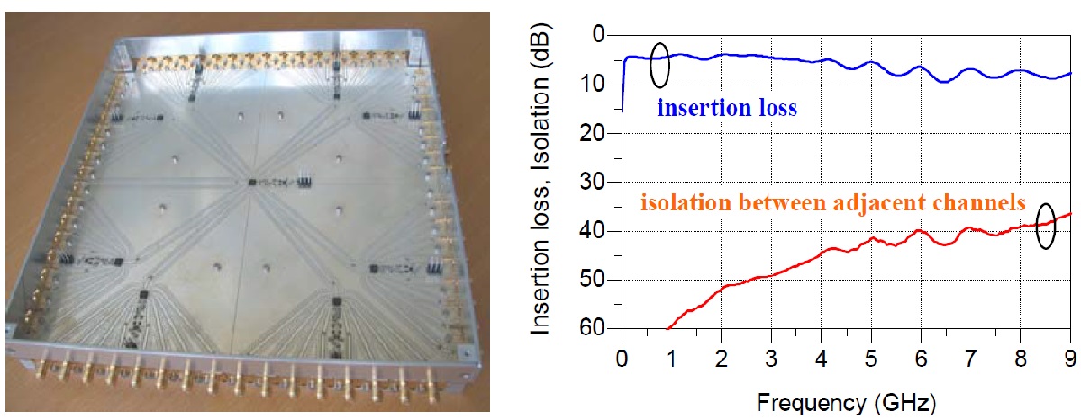 The switching network has an insertion loss of less than 5 dB at frequencies below 3 GHz (9.6 dB up to 8 GHz) and at least 39 dB of isolation.